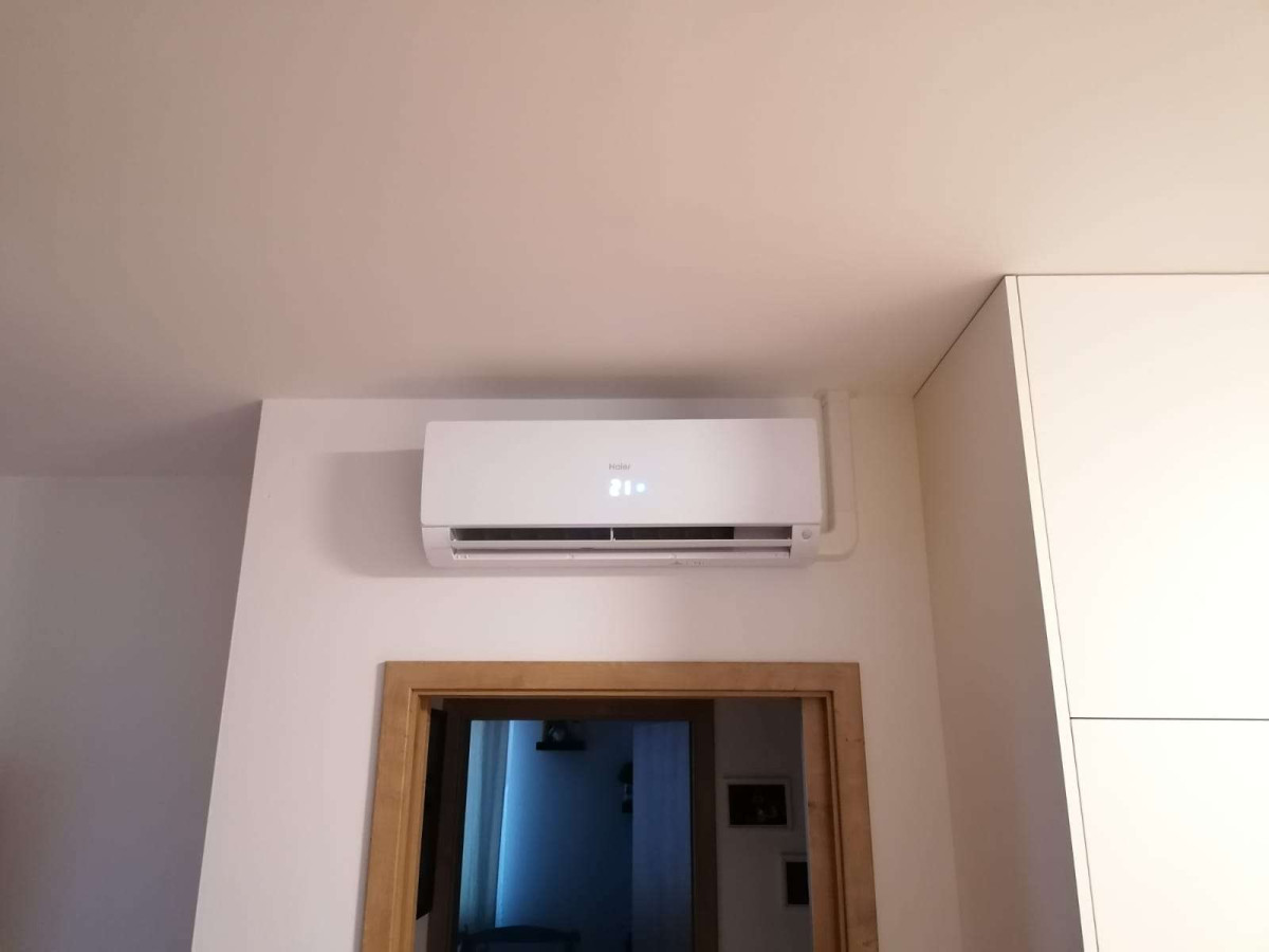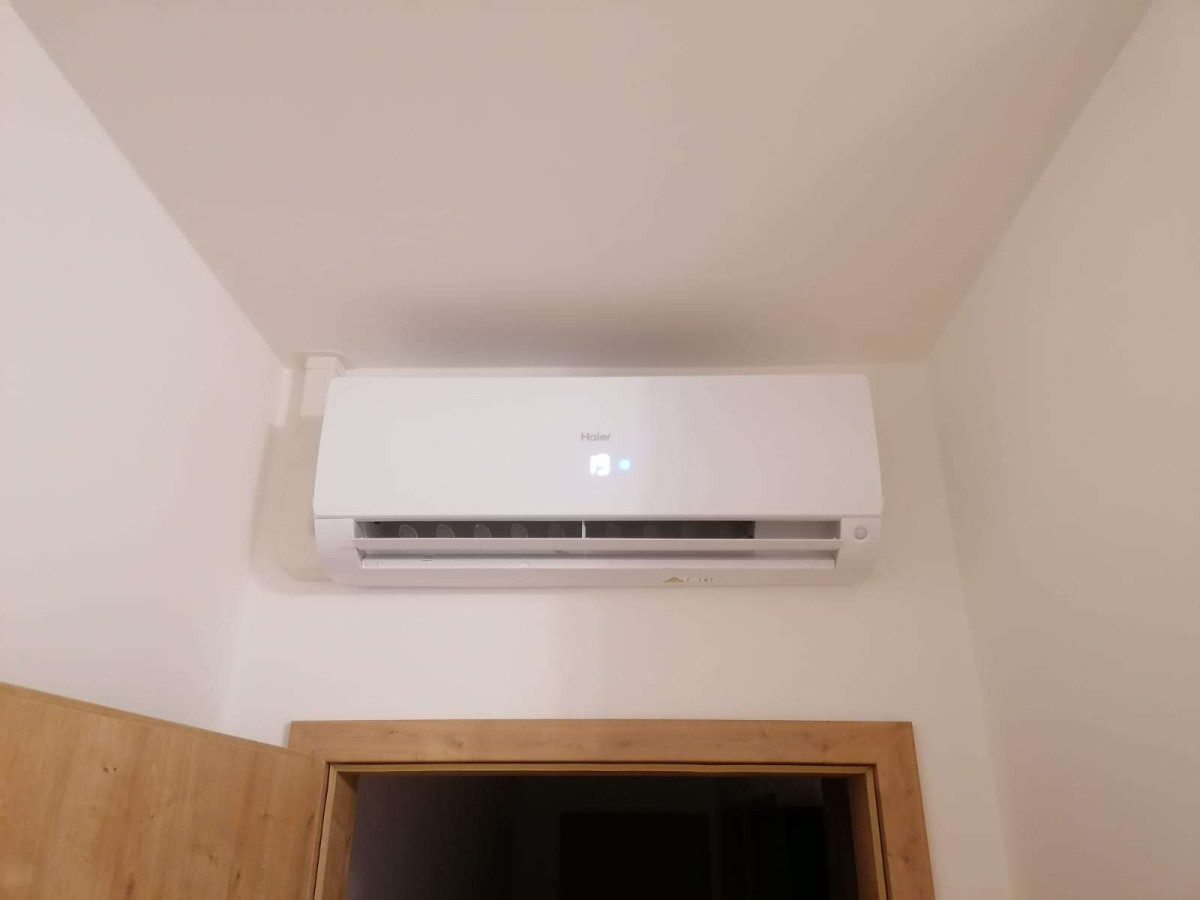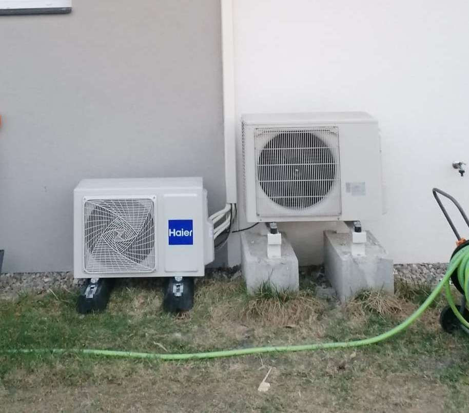 Výkon 2x 2,6 kW, venkovní jednotka umístěna na antivibračním podstavci. Typ vnitřních jednotek Haier Flexis.