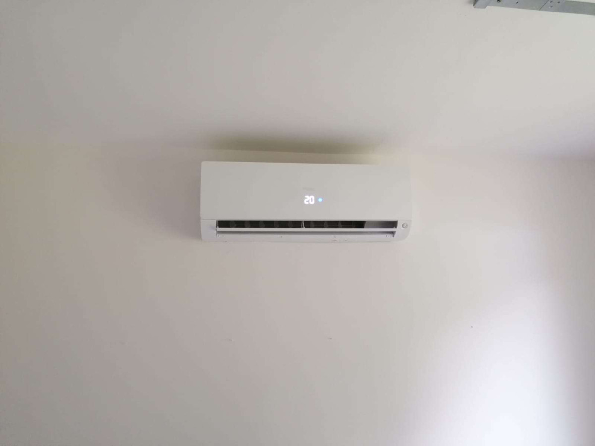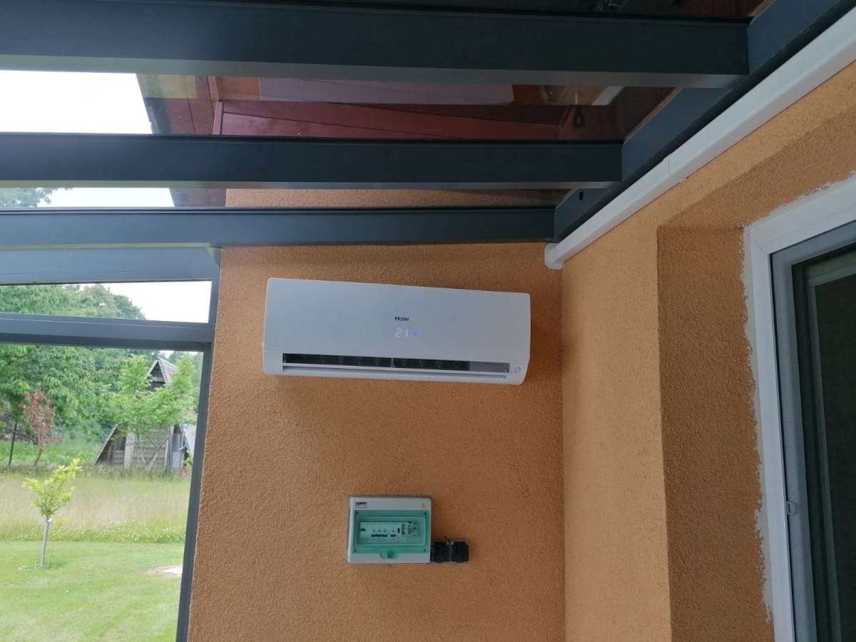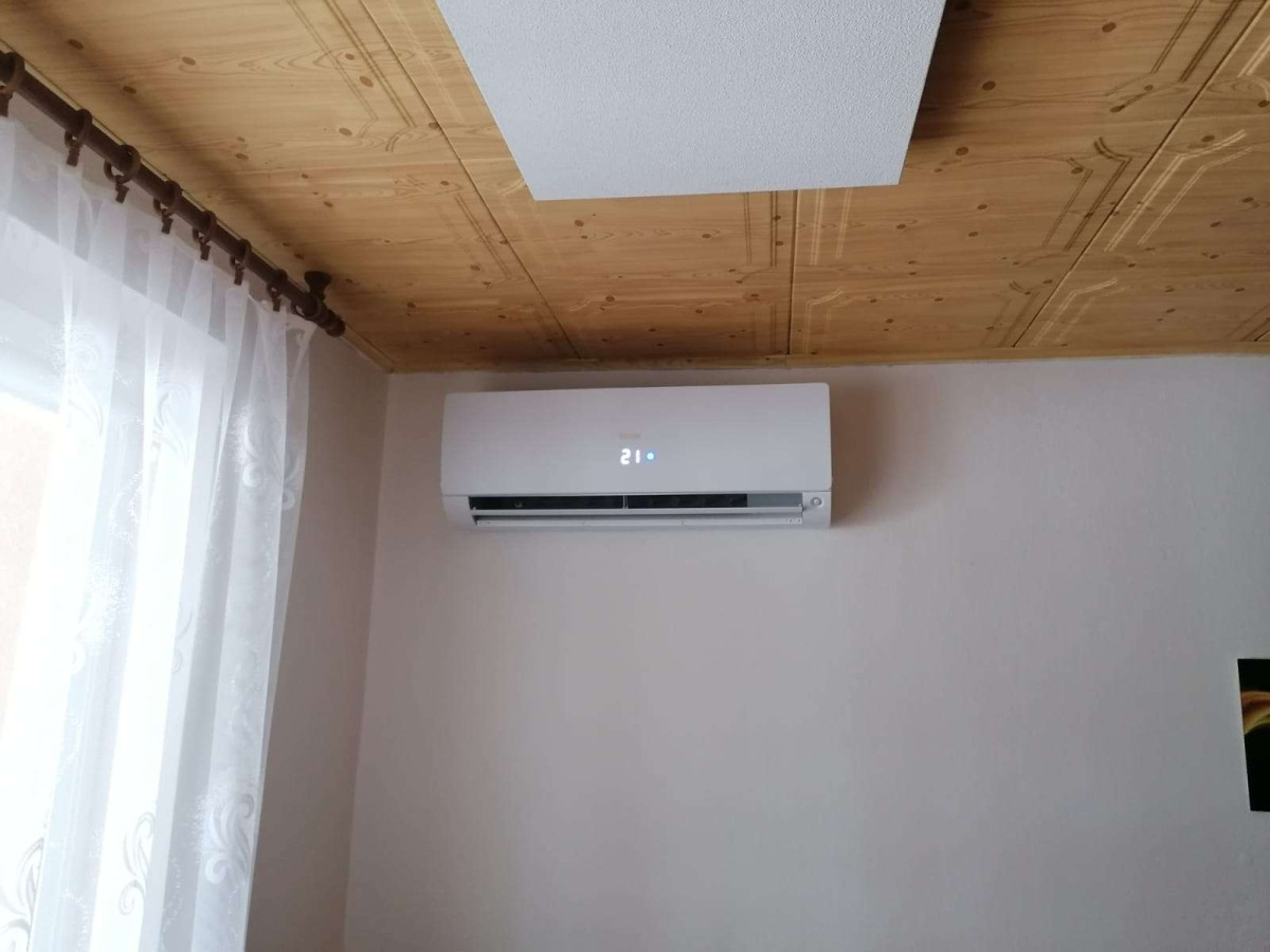 Výkon 2x 2,6 kW a 1x 3,2 kW, venkovní jednotka umístěna na antivibračním podstavci u paty domu. Typ vnitřních jednotek Haier Flexis.