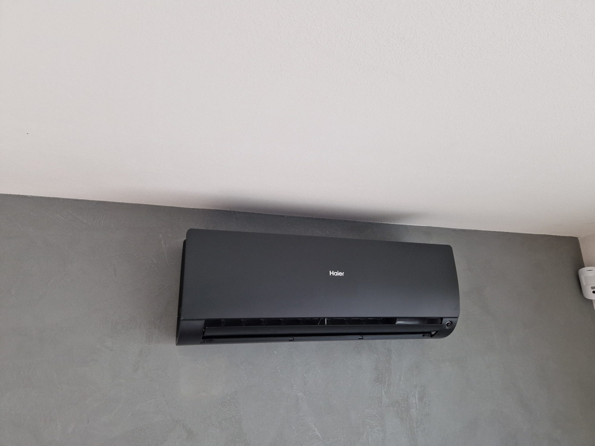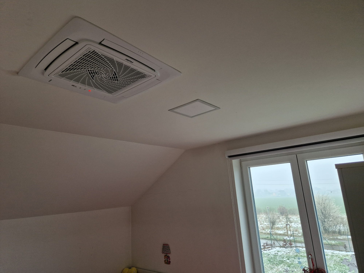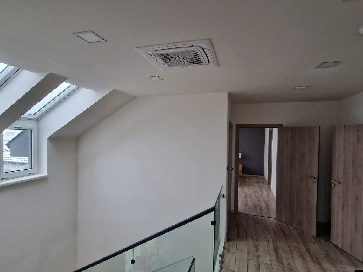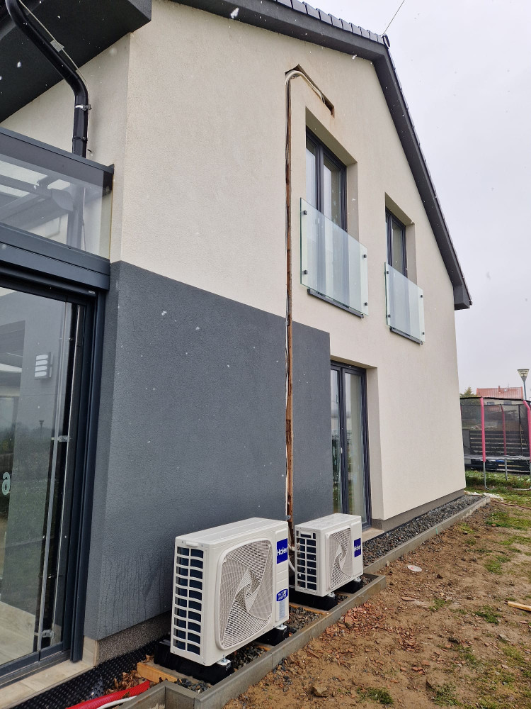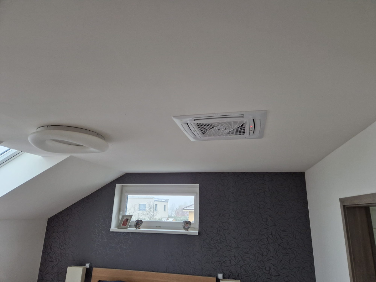 Nástěnná černá klimatizace 1+1 a stropní kazety 1+4 s venkovními jednotkami na zemi u domu.